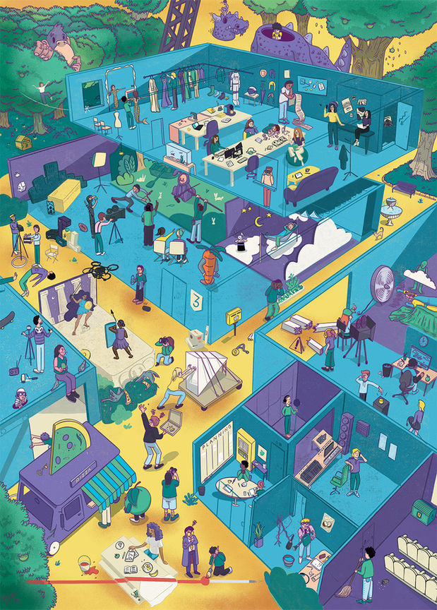 Une illustration foisonnante où-est-charlie-esque sur le thème du cinéma pour la société de production Pomme Verte !